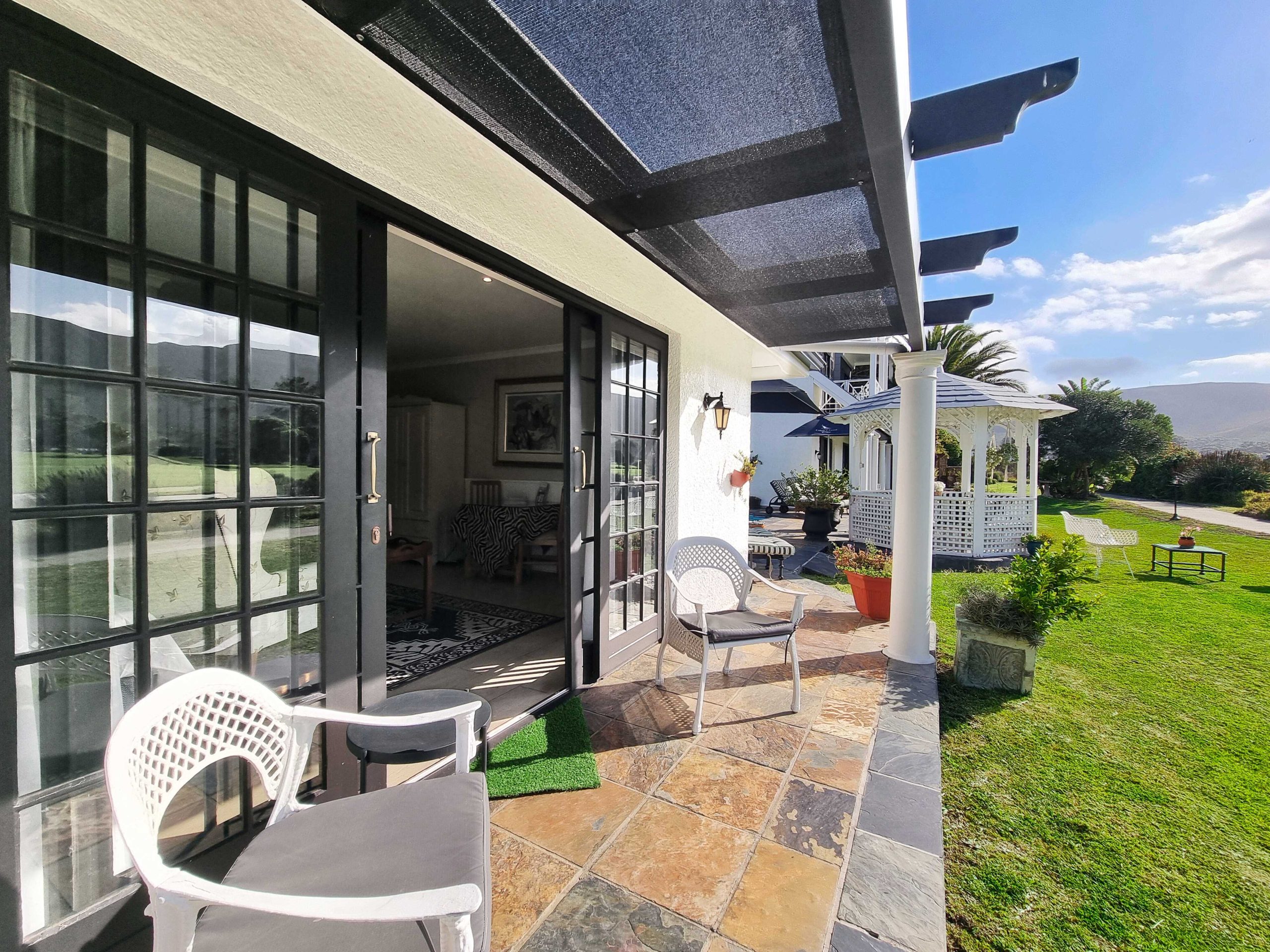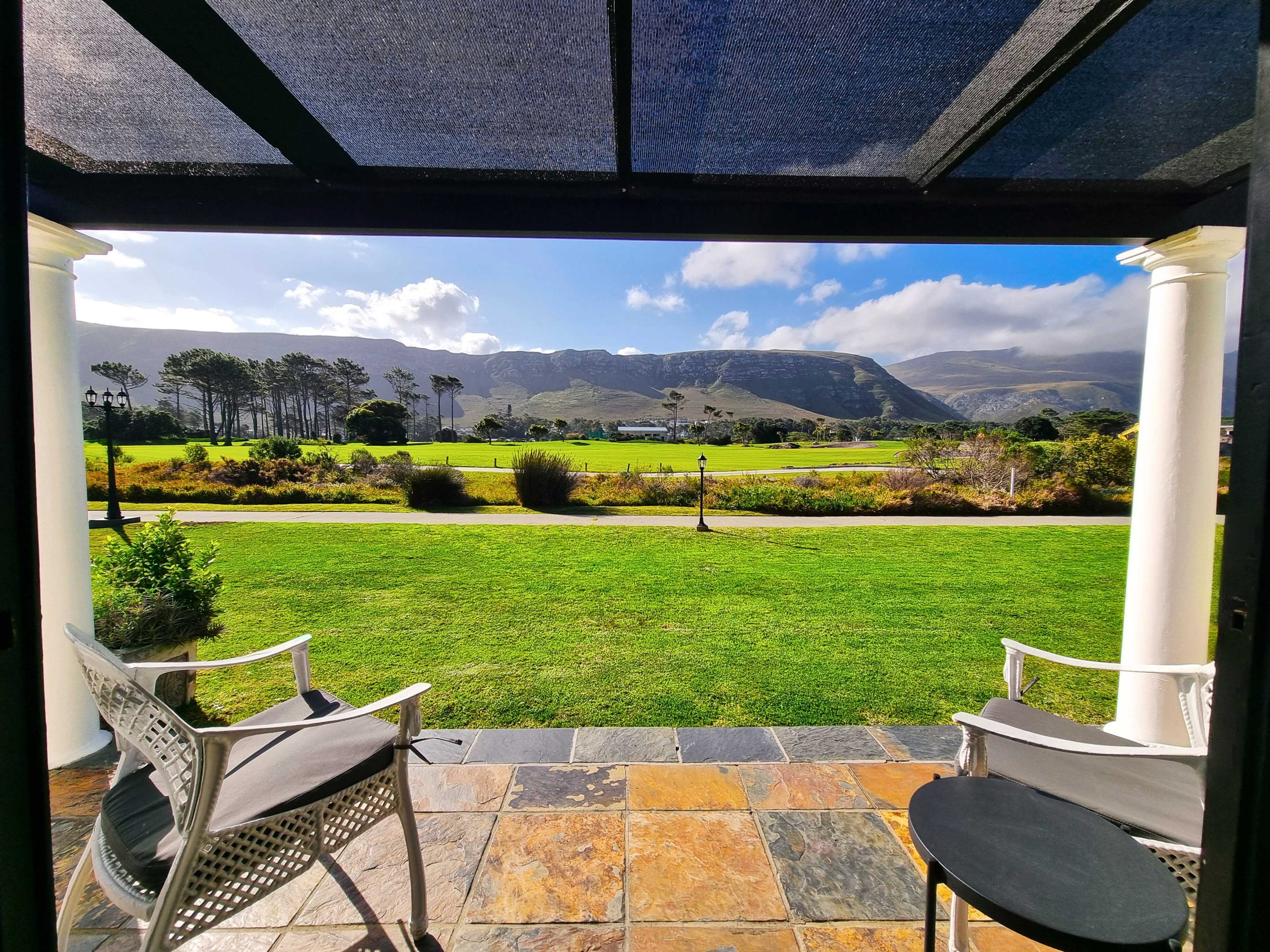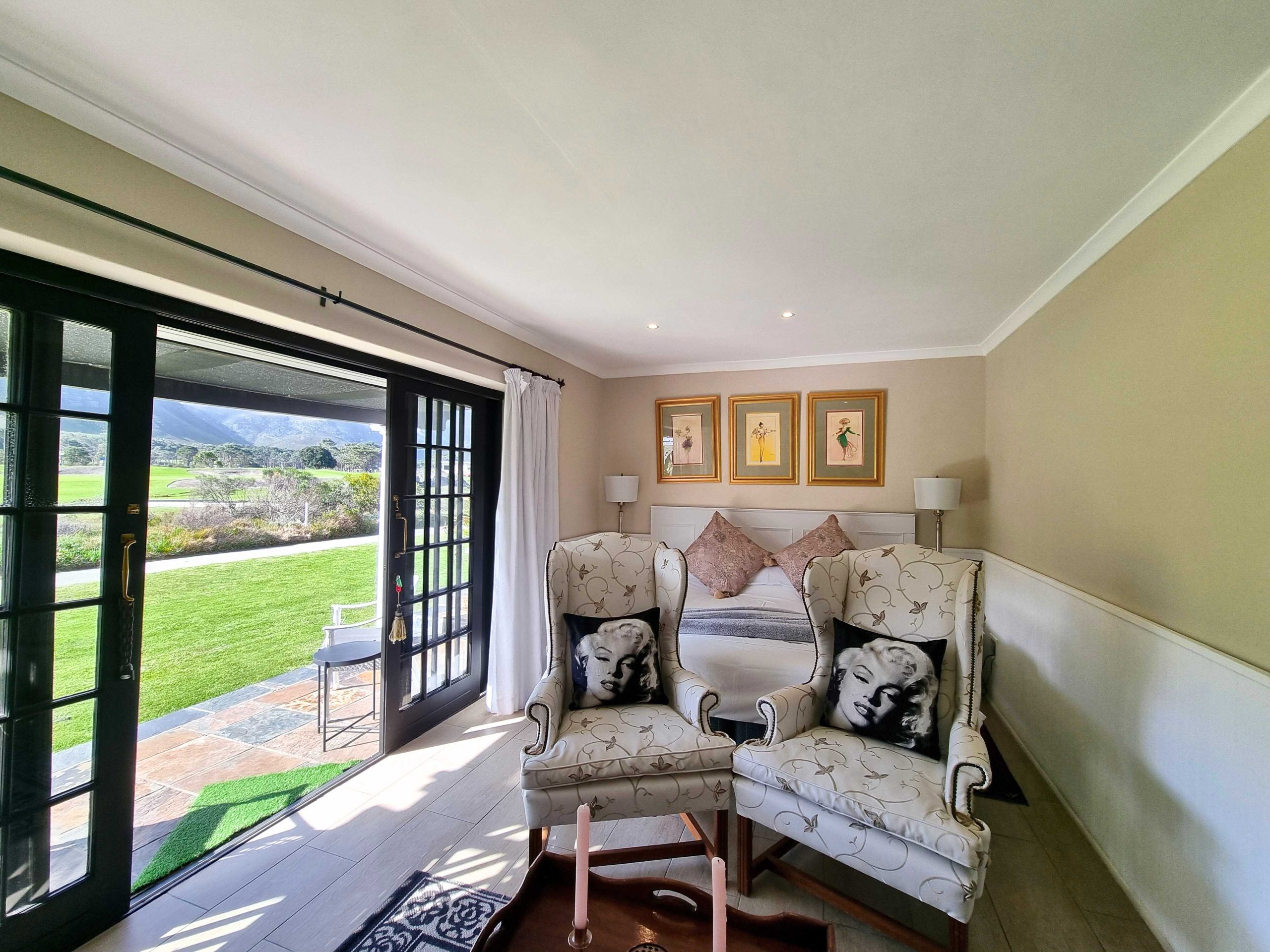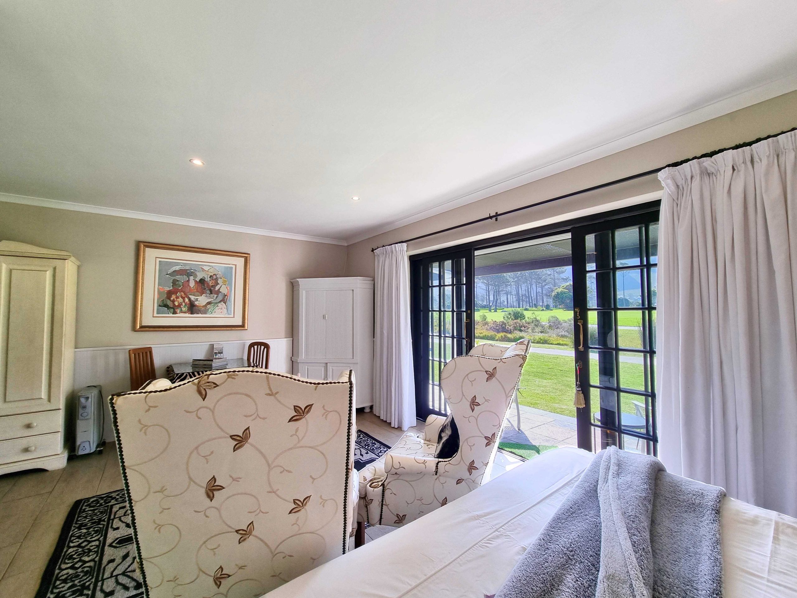 Luxury & spacious ground floor room with twin beds shifted together to form a double & En-suite bathroom. Patio doors leading onto the 27th fairway of the Hermanus golf course with beautifull mountain views.